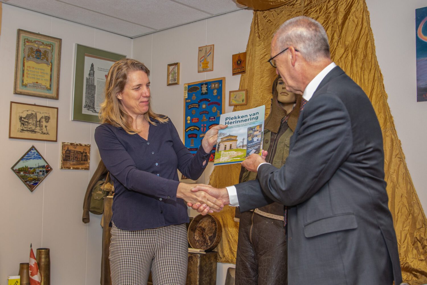 Burgemeester Adriaan Hoogendoorn neemt op 4 mei 2022 het eerste exemplaar van het tijdschrift ‘Plekken van Herinnering’ in ontvangst