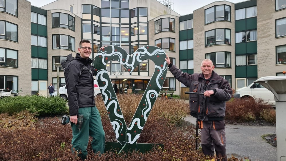 De mensen van de Heemtuin hebben hard gewerkt de afgelopen weken. Het resultaat: vijftien grote houten harten, kleurrijk beschilderd en voorzien van lampjes. ,,Iedereen heeft meegewerkt,” vertelt begeleider Eisse Oosterheert. ,,En ook het plaatsen doen we met onze mensen zelf.” Bijna iedere woonzorginstelling in Midden-Groningen heeft straks een groot lichtgevend hart in de voortuin staan. Ook staan er twee harten in Winkelcentrum De Hooge Meeren en bij het tijdelijke gemeentehuis, aan de rand van de A7 in Hoogezand. En dat de harten in de smaak vallen blijkt bij het plaatsen. “Wat hebben jullie dat geweldig gedaan!”, roept Sylvia Westman van De Burcht uit als daar de harten worden uitgeladen.