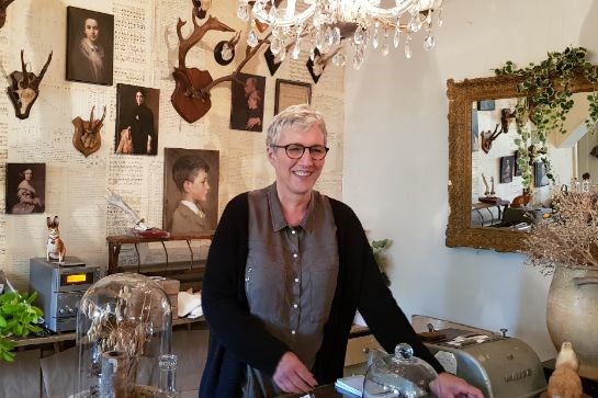 Het is even zoeken naar brocante winkel Sientje’s dochter. Aan het einde van een zijlaantje van de Hoofdweg in Hellum ligt tussen de bomen en de rondscharrelende kipjes de sfeervolle winkel van Elly van Houten en haar man Wim. Waar je ook kijkt in de winkel, overal zie je kopjes, borden en schoteltjes. ,,Ik ben dol op servies, en hoe gebloemder hoe beter. Daarom ga ik ook graag naar Engeland, daar vind je dat. En dan stel ik me voor hoe daar een prachtige tafel in een landhuis mee gedekt werd.” Verder zie je in de winkel kroonluchters, keukengerei, geweien, schilderijen (,,Ik ben dol op bloemenschilderijen!”) en meubels. ,,Oude kasten met laatjes vind ik ook prachtig.” En de naam van de winkel? ,,Mijn moeder heette Sientje, vandaar.”